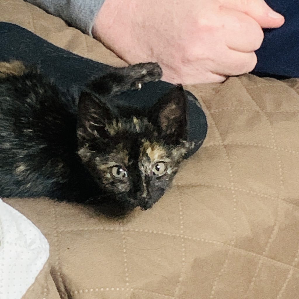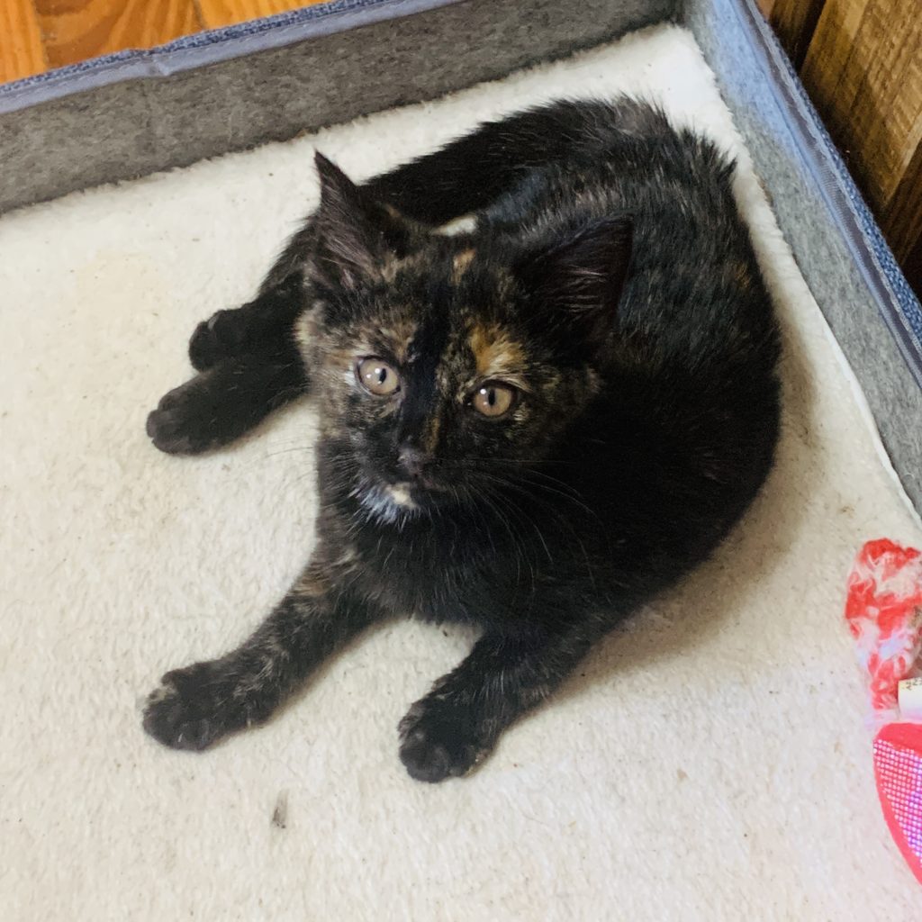 Little Pearl (Mini Pearl!) was a drop off. The step father of a member of our gaming group had found a little singleton kitten, approximately five weeks old, and brought her to us.