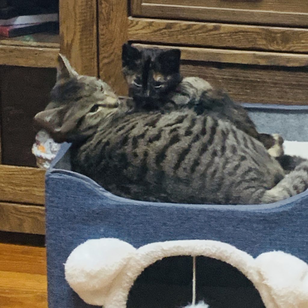 When she started to feel better, we introduced her to Bash and Finn (two six month old cats we had taken in), and the trio formed an impromptu pack, with Pearl serving as Alpha, despite being significantly younger and smaller than her larger packmates.